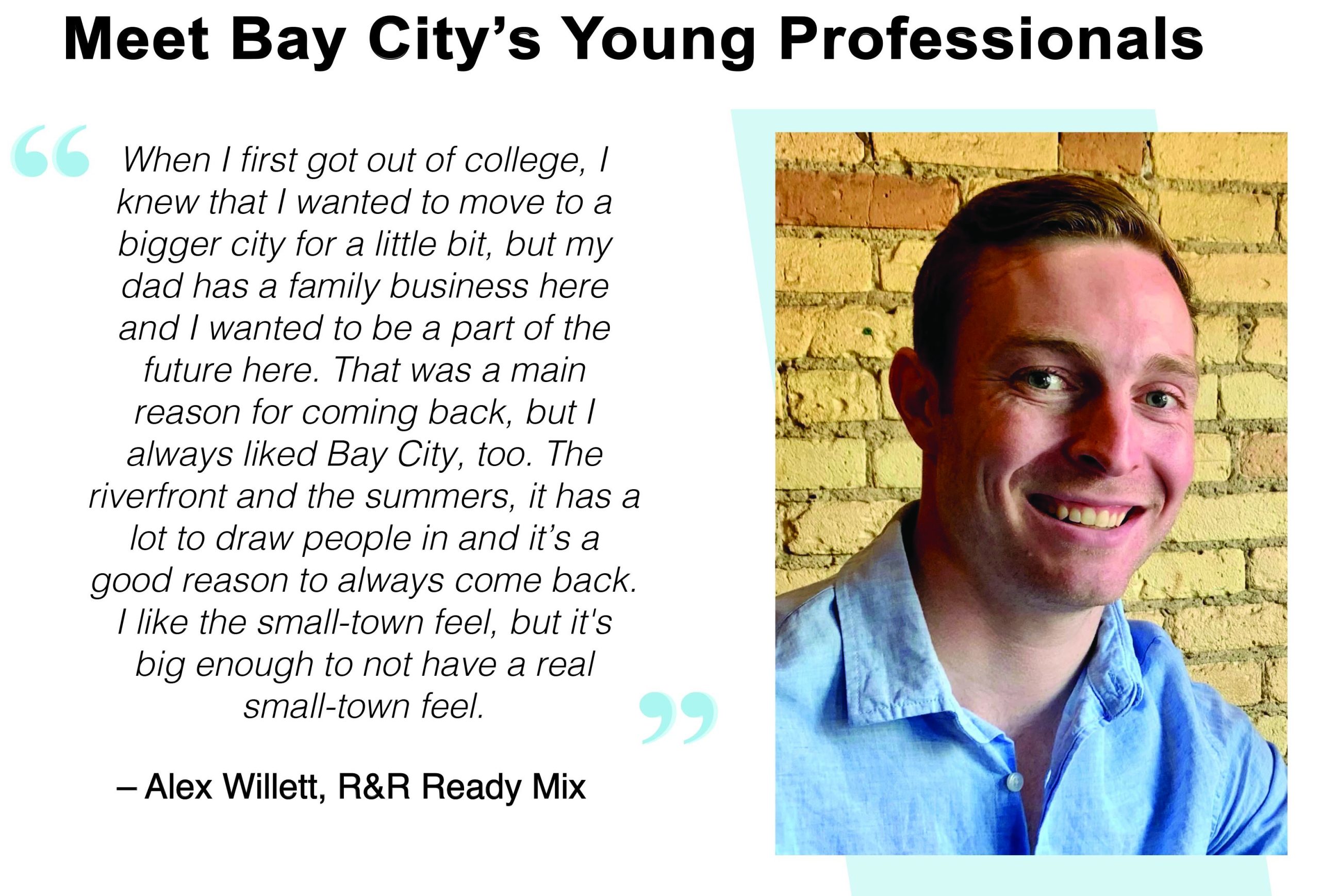 A: When I first got out of college, I knew that I wanted to move to a bigger city for a little bit, but my dad (Russell A. Willett) has a family business here and I wanted to be a part of the future here. That was a main reason for coming back, but I always liked Bay City, too. The riverfront and the summers, it has a lot to draw people in and it’s a good reason to always come back. I like the small town feel, but it’s big enough to not have a real small town feel.