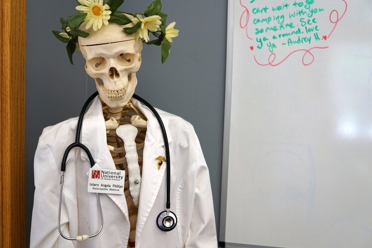 While Phillips lost both Dr. Palka to cancer and her cousin Reed, she counts the both of them as part of the inspiration and drive behind her new journey as a doctor. She inherited all of Dr. Palka’s medical texts for naturopathy – at more than 140 titles – from Kim’s husband, as well as her office skeleton, which fittingly sits in the corner of her new office wearing Phillips’s lab coat from her internship and sports a “Live Like Reed” bracelet, from the Live Like Reed annual golf outing, organized by the Reed Phillips Family Fund.