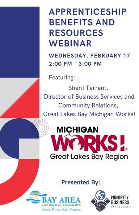 The Apprenticeship Benefits and Resources Webinar is scheduled for Feb. 17 from 2 to 3 p.m. Sheril Tarrant, director of Business Services and Community Relations for Great Lakes Bay Michigan Works!, will lead the event.