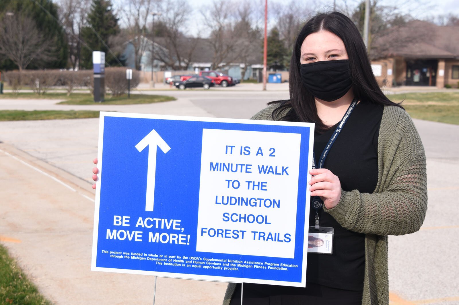 Erin Barrett holds a walking trail sign in Ludington.