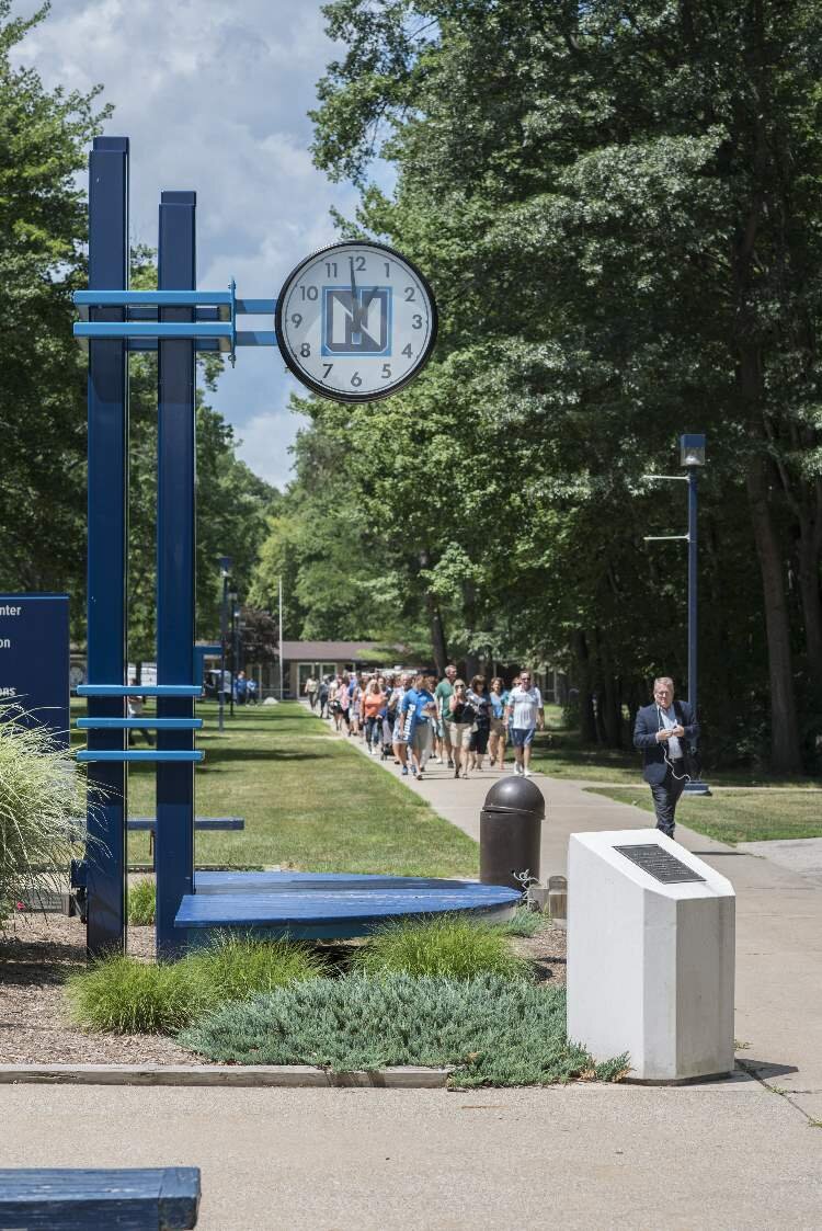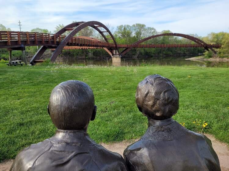 Near the Tridge, you can get on the Pere Marquette Rail Trail. If you’re feeling ambitious, you can ride your bike northwest all the way to Clare, 30 miles away, or to towns in between, Sanford and Coleman. Less than three miles from the Tridge, the trail takes you past Northwood University. You’re encouraged by the university to get off the trail and travel through the campus nestled in the woods. In the center of the campus is the Mall Walk which features striking sculptures, including one of Abraham Lincoln riding a horse. He’s also reading a book so it might be an early example of “distracted driving.