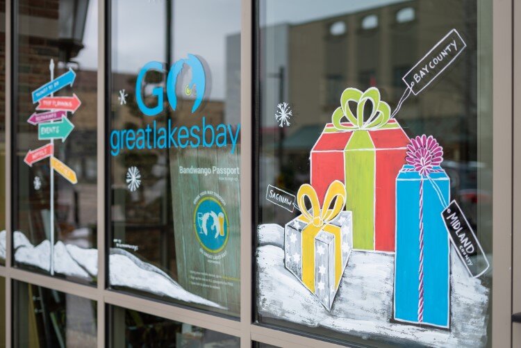 In addition to snowmen, you’ll also see holiday wreaths, garland and wintery scenes. The strategic building block message on the window of Joyful Tantrum and the gifts to our neighboring communities painted at Go Great Lakes Bay hold clever details appreciated by onlookers. “Some of them are more whimsical, while others are meant to be more detailed and funny to draw your attention and make you smile,” says Thiefels.