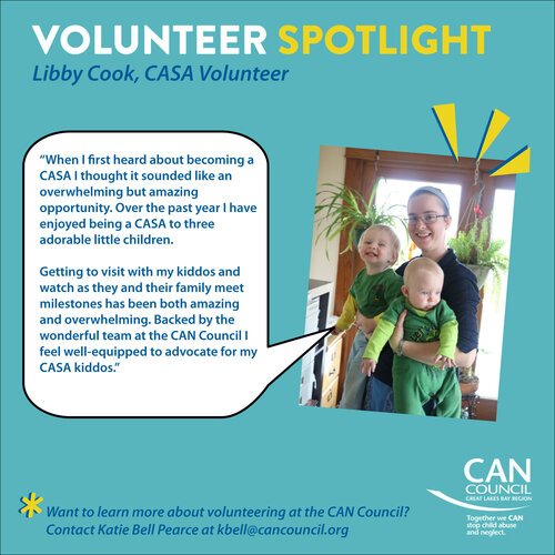 Being the voice of children who are in the court system due to abuse or neglect means advocating for a child in front of judges, attorneys, foster parents, biological parents, teachers, counselors, and others. Each CASA is assigned to one family at a time. The CASA stays with the family as long as the children are in foster care. That could mean volunteering for one year or six years, says Katherine Griffiths, CASA director for the CAN Council Great Lakes Bay Region.