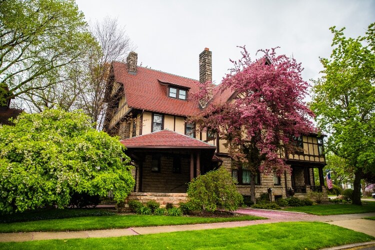 Features of this style are the home’s stucco and half-timbering insets. The home has multiple intersecting gables, with the cross gable’s upper portions projecting over the lower portions. It also has Tudor Revival elements to it resembling medieval English structures with wood framing and infill plaster.