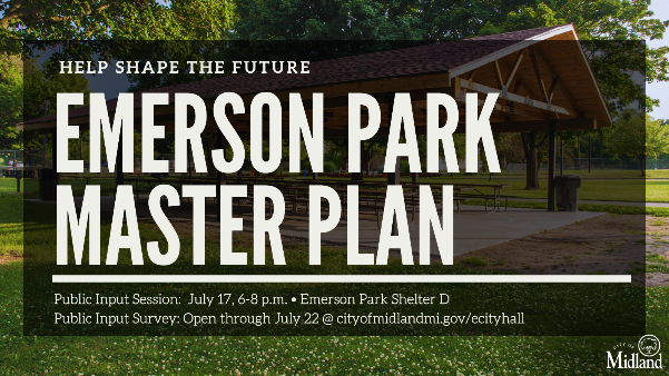 For more information on Emerson Park, visit www.cityofmidlandmi.gov/emerson. For more information on the master planning process, contact Parks and Recreation by calling 989-837-6930 or emailing recreation@midland-mi.org.