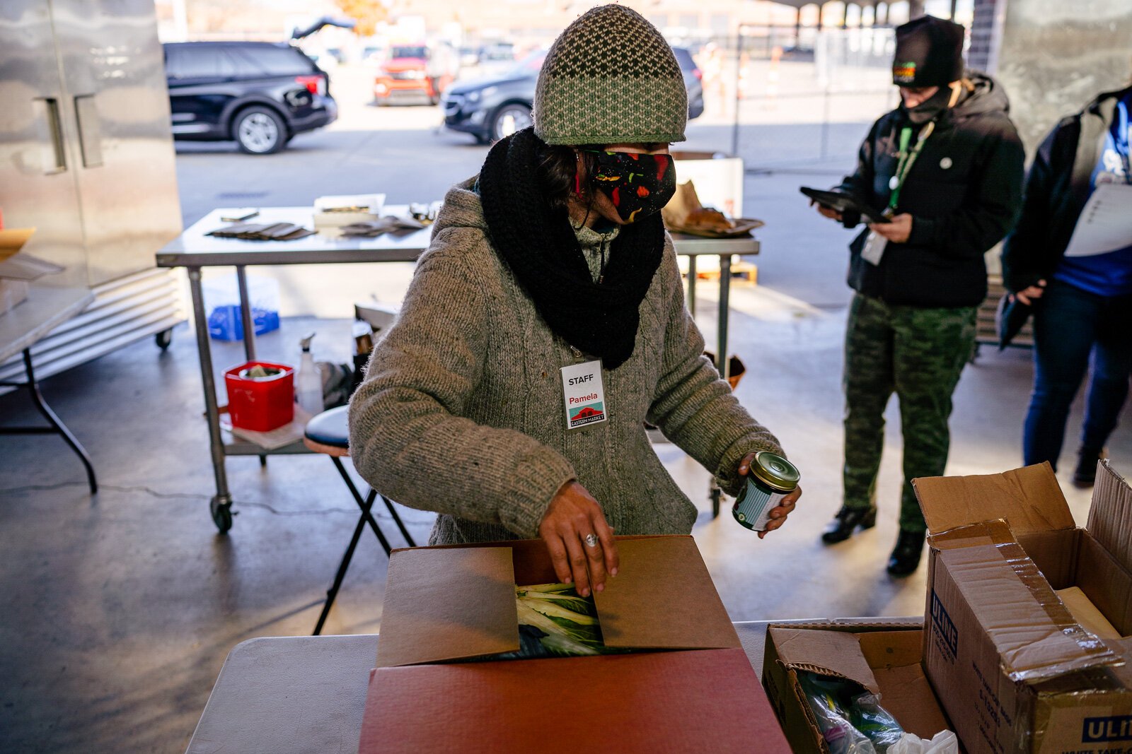 Nick Hagen – Eastern Market staff load food boxes that were ordered online.