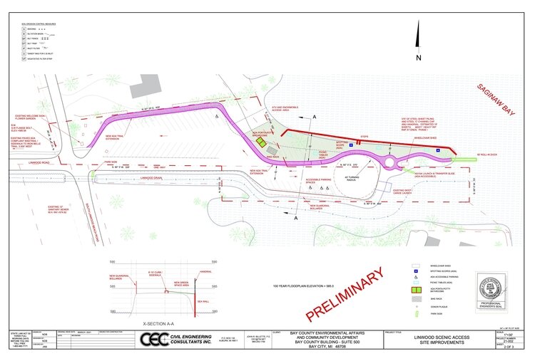 Improvements for the Linwood Scenic Access Site include sidewalks, a dock, and a kayak launch