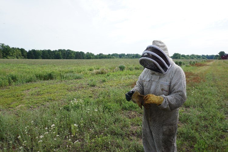 He stops before reaching the hives to don his beekeeper suit, a pair of thick, nitrile gloves, and honey-stained leather gloves. In the backseat, tucked safely in a U.S. Postal Service box, are two queen bees – just in case.