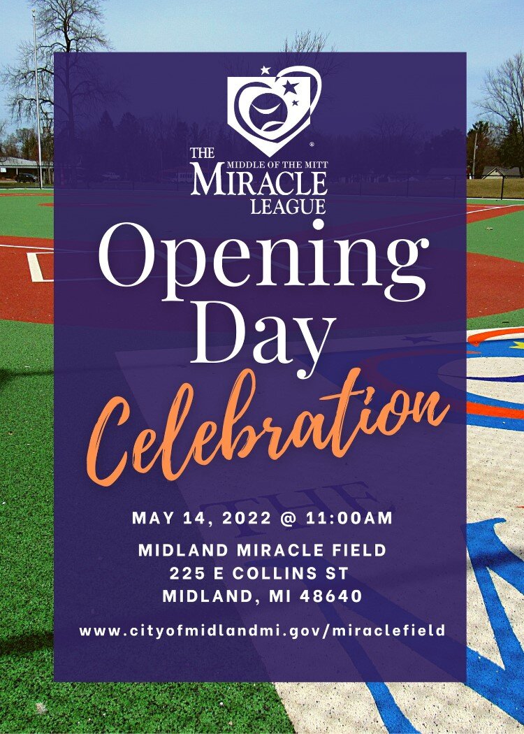 Opening Day for the Middle of the Mitt Miracle League is Saturday, May 14 in Midland’s Central Park. The public is welcome to attend the baseball games. The Middle of the Mitt Miracle Field was built with the support of many donors and was coordinated by the City of Midland’s Parks and Recreation Department.