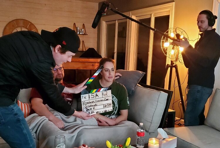From left, Justine Brooks appears as Rebecca Redding; Josh Sobeck is on sound, Gradowski is director, and Zach Hamila is the camera operator.