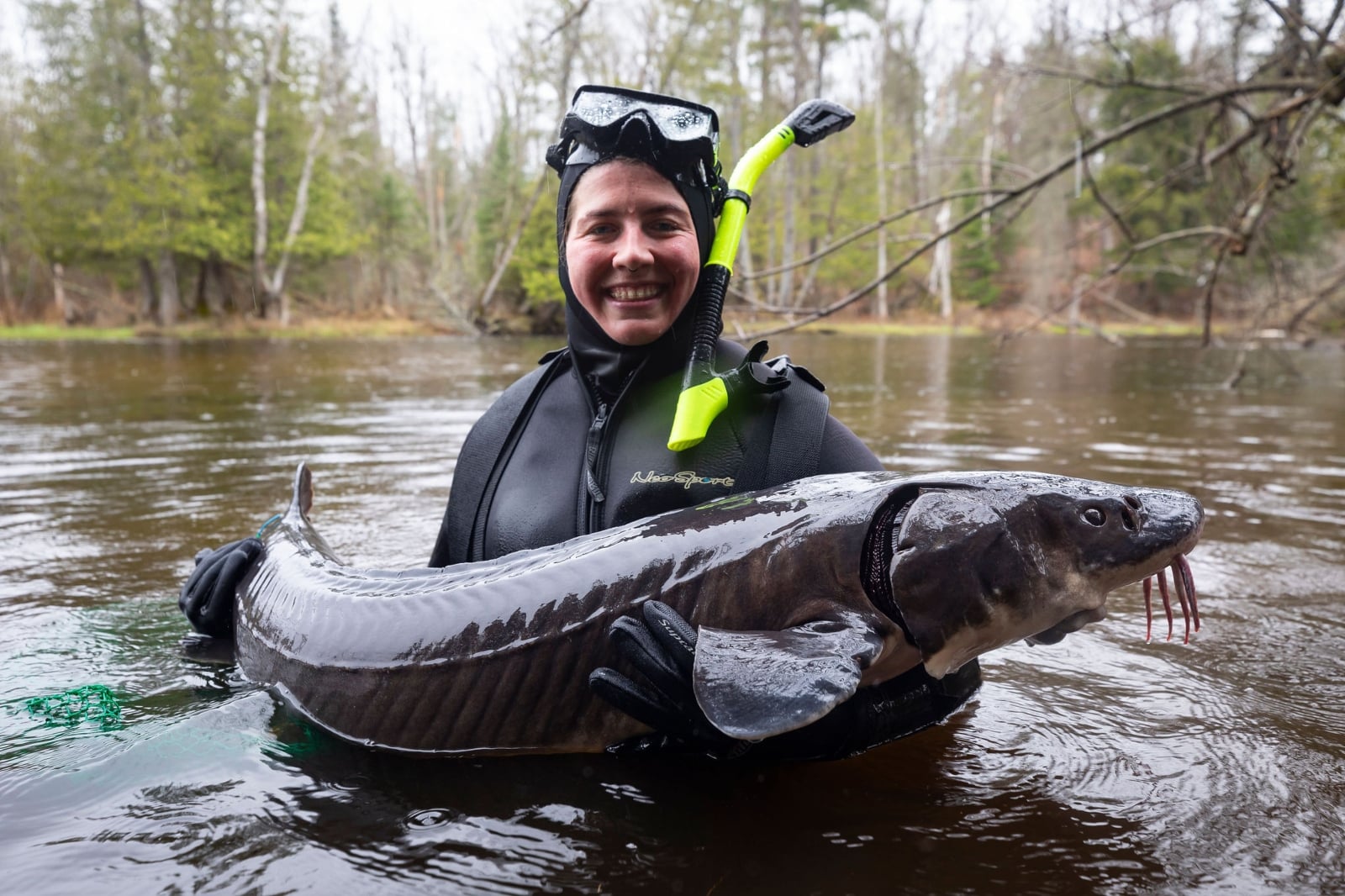 “The fish has these bony scutes that are, when they’re younger, they’re really sharp,” she says. “As they get older, the lake sturgeon is a bottom feeder, and it rubs its body along the shores and rocks, so over time those scutes can get dull.”