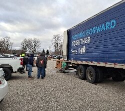 Volunteers from LiUNA 1098 and the United Way of Bay County faced the cold to distribute food in Pinconning. Long lines outside the distribution point highlighted the growing need for community support.