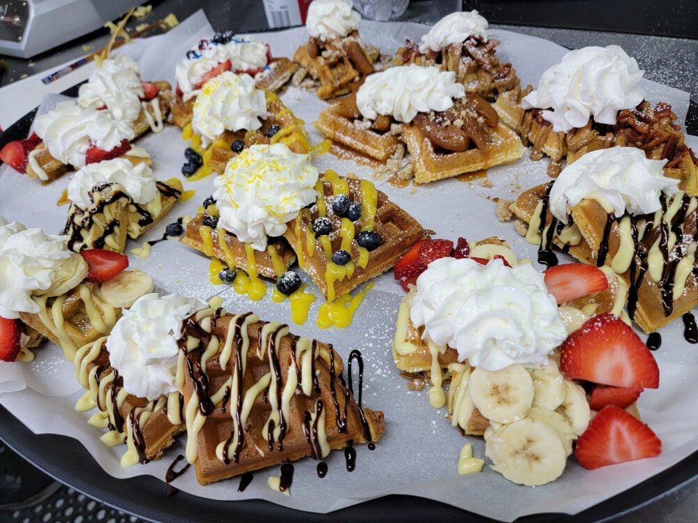 Their best seller is the Strawberries and Cream on a Liege. The waffle is topped with fresh-cut strawberries, cream cheese and maple syrup drizzle, whipped cream, and graham cracker crumble, with a dusting of powdered sugar.
