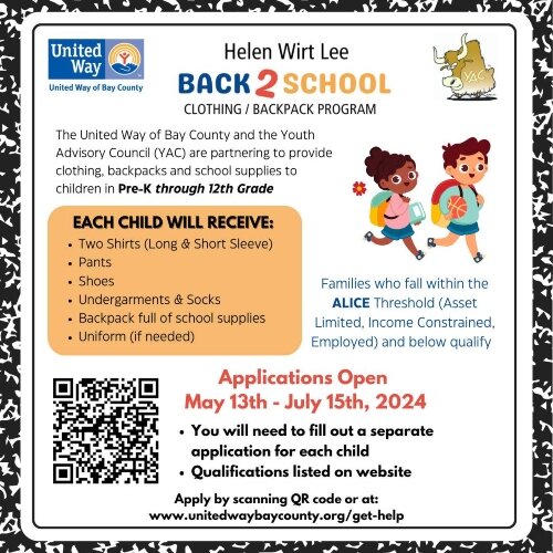 The program, created by a partnership between the United Way of Bay County and the Youth Advisory Committee of the Bay Area Community Foundation, provides clothing, backpacks, and school supplies to children who meet income guidelines.